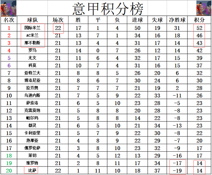 积分榜方面,国米逆转大胜比萨之后,先赛的他们领先第2的AC米兰6分,多第3的那不勒斯9分,继续坐稳榜首位置。比萨遭逆转惨败后,净胜球劣势,换掉维罗纳,成了新的副班长。